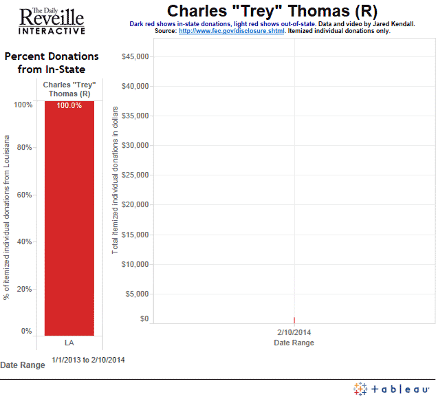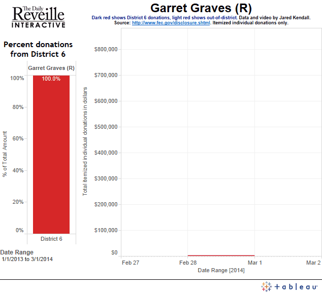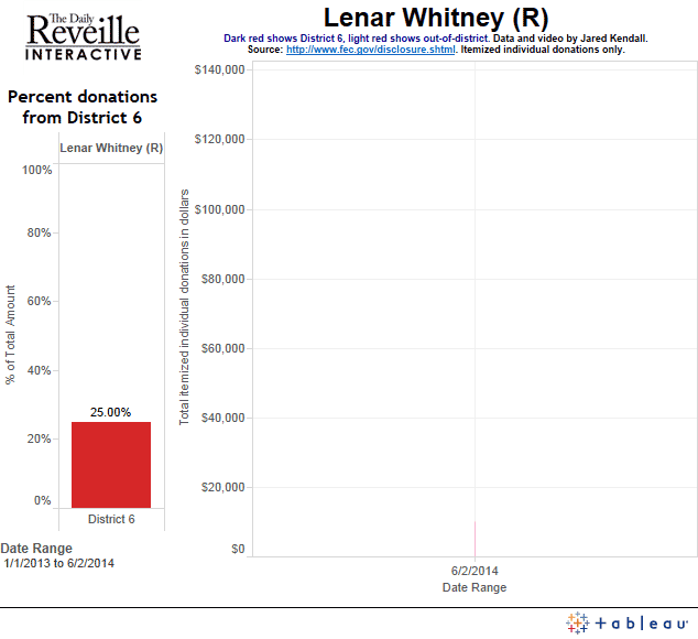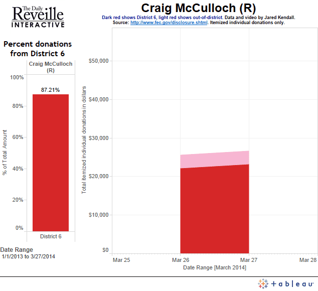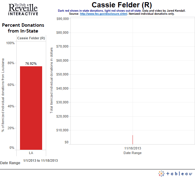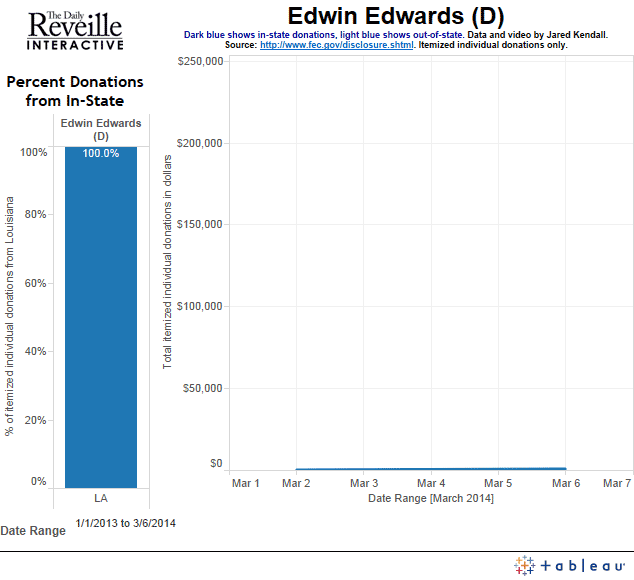 Before you become completely offended by so much outside money flowing into Louisiana, it’s important to have a benchmark. Hence, we take a look at Kentucky, where *both* Senate candidates are running at roughly 20% in-state donor levels. Let me know which design you prefer, by the way – I like the Louisiana animation better. It’s more recent, and I think I improved it with time. I’d like to know what everyone else thinks.